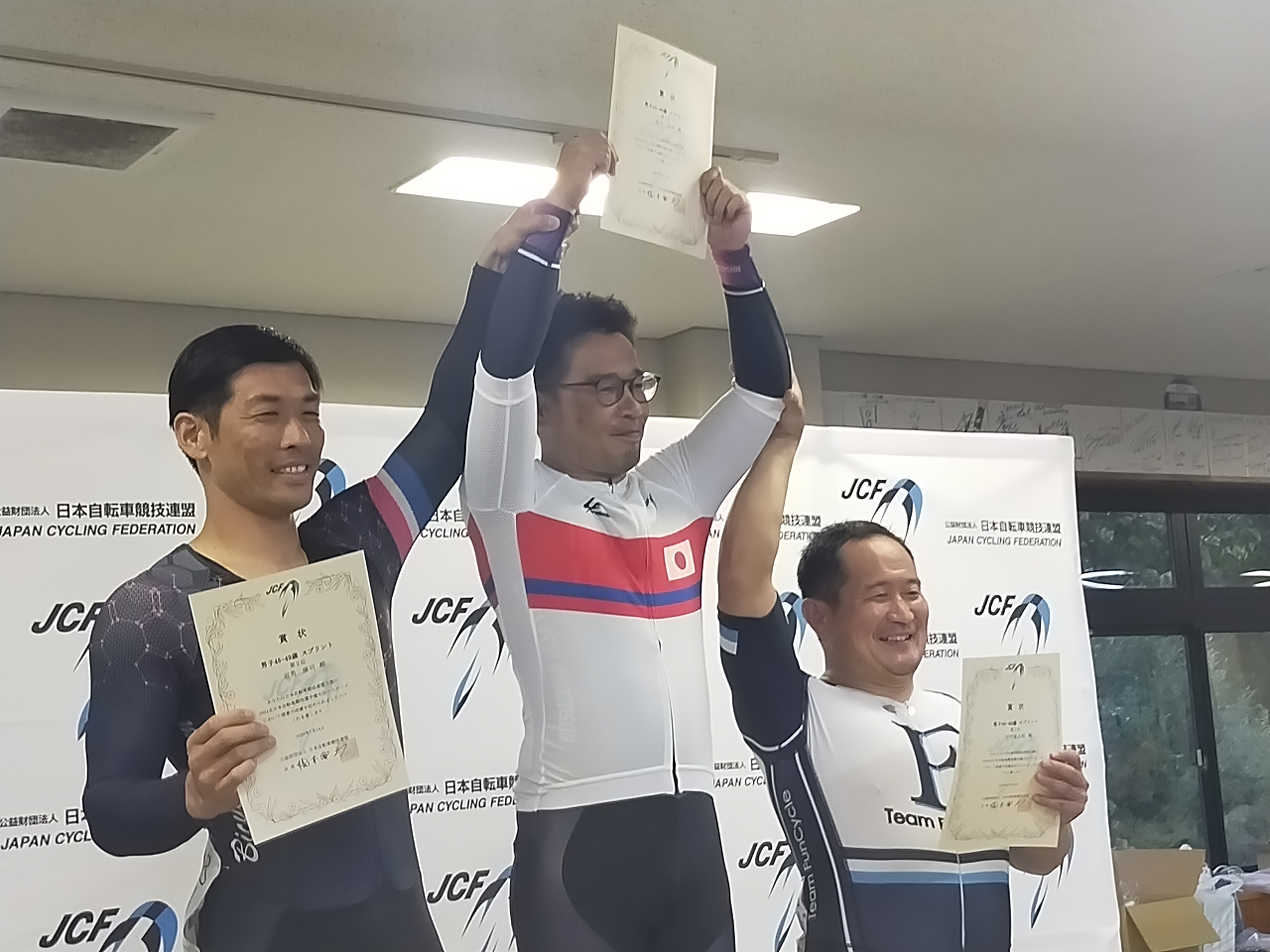 〔画像左より:羽田野選手・浅香長野県自転車競技連盟理事長・武井選手〕