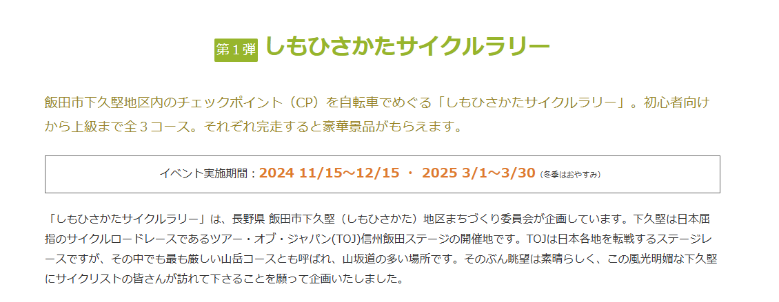 「ツアーオブジャパン信州飯田ステージ」のスタート地点である飯田市下久堅地区で【しもひさかたサイクルラリー】が11月15日より開催されます。このイベントはTOJ信州飯田ステージのコースを利用したイベントで、自転車にて自転車にて指定チェックポイントを巡り、写真撮影・SNSへアップすれば、ひさかた和紙のオリジナルグッズをプレゼントいたします。詳しくは下記の通りです。